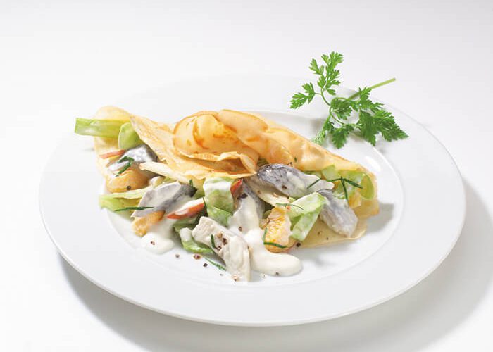Wie Meeresgott in Frankreich: Crêpes mit Bismarckheringsstreifen in Joghurtcreme mit Apfel und Orange. Probieren Sie zarte, bissfeste Bismarckheringe in süß-säuerlich abgestimmter Marinade mit einer erfrischenden Joghurtcreme.