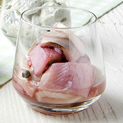 arte Heringshappen süß-sauer mariniert, mit Zwiebeln und Gewürzen eingelegt. Leichte Sherrynote.